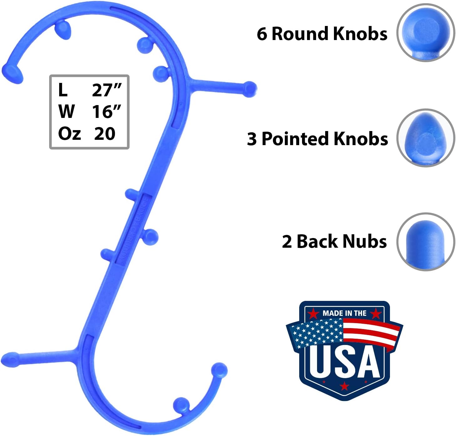 2 Hooks Are Better Than 1- The 2 hooks and 11 knobs (in 3 different shapes) were created to alleviate pain and soreness across the entire body. Unlike single muscle hook designs, the two hooks on the Elite let you apply more leverage to more parts of the body. The 3 different shapes include acorns for deep tissue, round for gliding over larger muscle groups, and nubs for the lower back. Also, the Elite offers 4 non-slip grips to ensure that you never lose control while applying pressure.