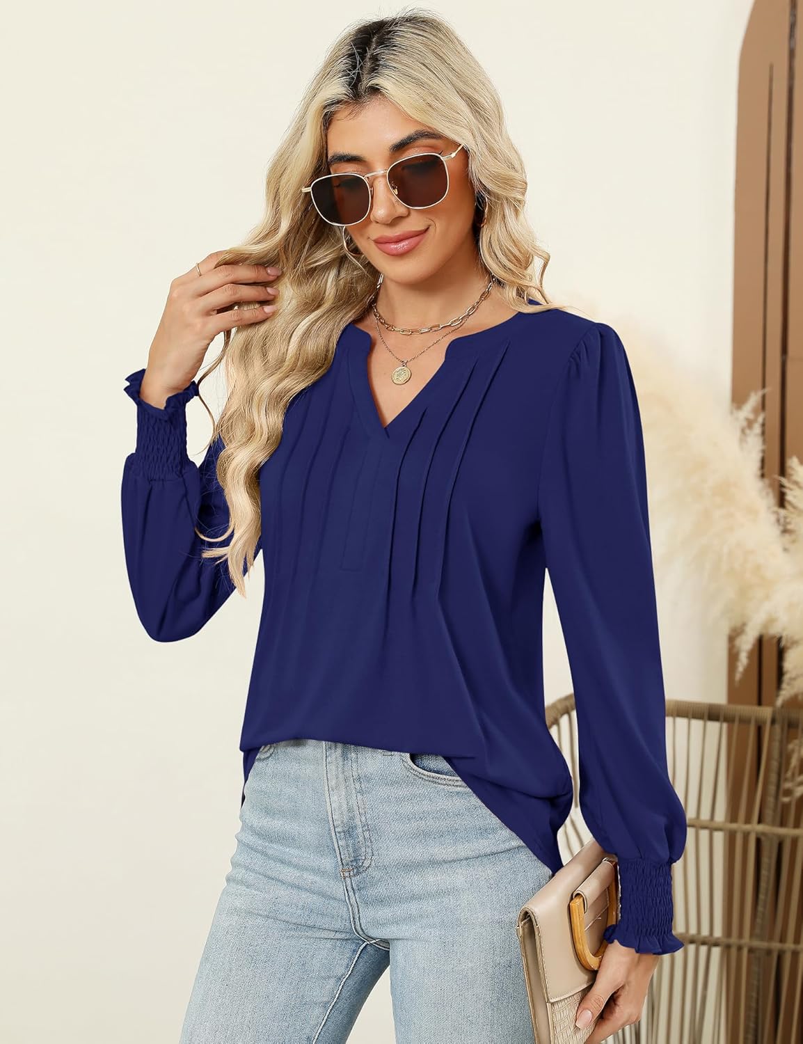 LOMON Long Sleeve Tops for Women Pleated V Neck T Shirts