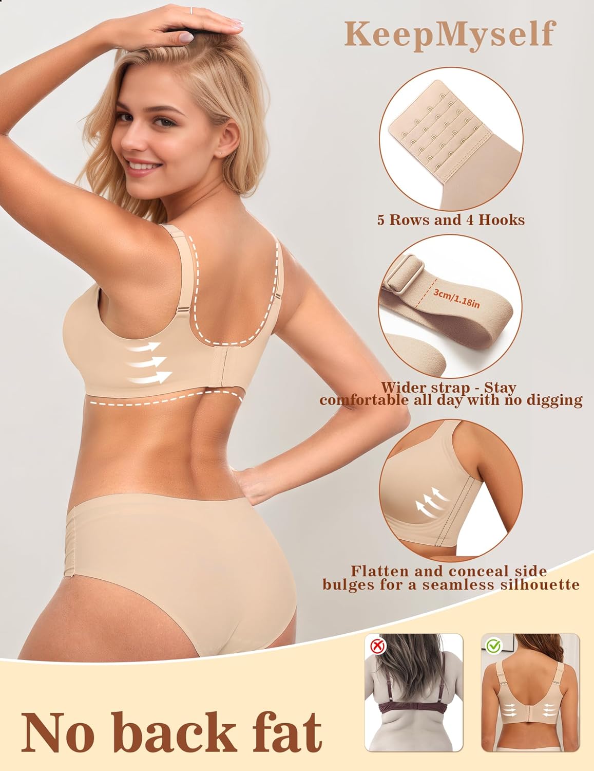 I bought this bra with 2 others so I could compare- I received 2 of them on the same day. The two I received appeared identical- but they were branded differently. So I’m going to review both. Of the two bras, the KeepMyself Women’s is only getting 4 stars while the other one got 5 stars.I’ve been desperate for something that doesn’t cost a fortune but is comfortable, supports and defines my girls, covers my back fat AND is easy to take on and off. I have sensitive skin and silicone irritates, underwires dig, elastic itches and sports bras require Olympic level flexibility to take on and off without dislocating a shoulder joint.When I put this KeepMyself on, I was semi-impressed. Yes, it covers the back fat and is pretty comfortable to wear, but it gives me a uniboob. There is very little separation or definition. Otherwise the support seems good, it is relatively comfortable (except for the uniboob which I keep having to adjust).I have not yet washed it, so I don’t know how durable it is. I will say that the fabric is softer than a labrador retriever’s ears and my skin is not irritated at all. The straps easily adjust and it provides good support. The quality is similar to that of the other bra I purchased, the fit just isn’t the same. Because of that I probably won’t buy it again since the other bra I bought it with outscored this one. I will, however, keep this one as a back-up.